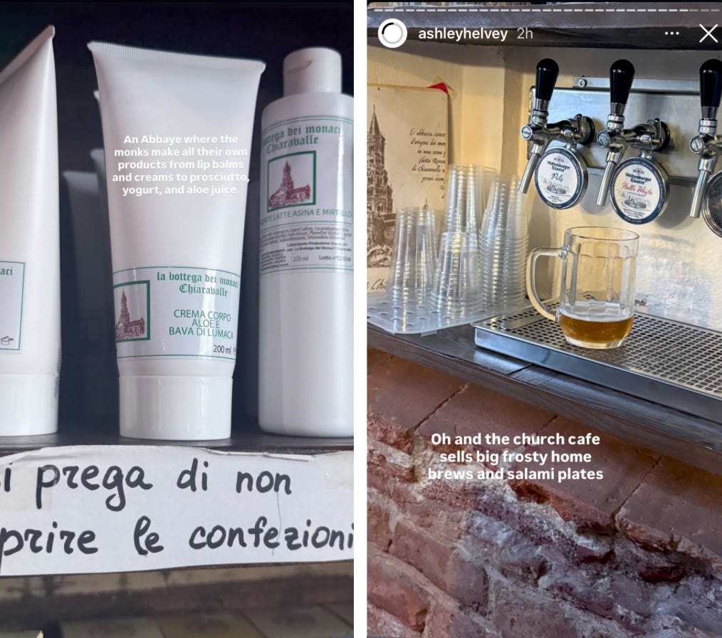 Reminder: Even though she never tags and you have to reverse image search everything, reluctant-resistant Provence influencer Ashley Helvey is a must-follow on Instagram for those thinking of traveling to the South of France this summer. This weekend, she was shopping at monasteries in Italy.