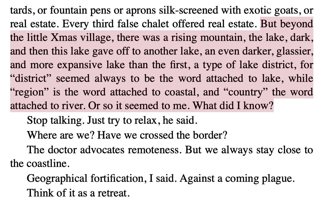 It’s a Hollywood story told in the first person by a defensive director in crisis. You might just describe it as Bloviating director remembers love affairs. (“My romantic entanglements with actors were blown out of proportion by the trade journals, and shoddily reported. But they weren’t entirely wrong.”) She’s a self-important bitch, technically, but Howard eeks humor out of every possible sentence skewering actors, acting, and fame. (Of a French actor eerily similar to Denis Lavant under the direction of Leos Carax: “His method of instruction was understated-mystical. For one very long sequence he limbered his ankles.”) Helena’s movies are image-led independent films of the sort still being made in black and white to fulfill a director’s ego needs. A typical plot: a “single protagonist, a grim figure, a stolid blank, numb isolation, and a roughly masculine projection from a bygone era.” Is it meant to be hilariously insufferable? I think so? (Actually, one of her works is quite reminiscent of Ottessa Moshfegh’s hyper-masculine first novel about a drunk sailor, McGlue, which Jean Stein always told me was an underrated work of genius.) I guess what I’m trying to say is it’s very funny in a Rivka Galchen sort of way. (Funny, then, only to the audience.) A good example: “It was in Grenoble, and I thought, I am walking up the mountain in the way a D. H. Lawrence character walks up a mountain. Irrevocably.”