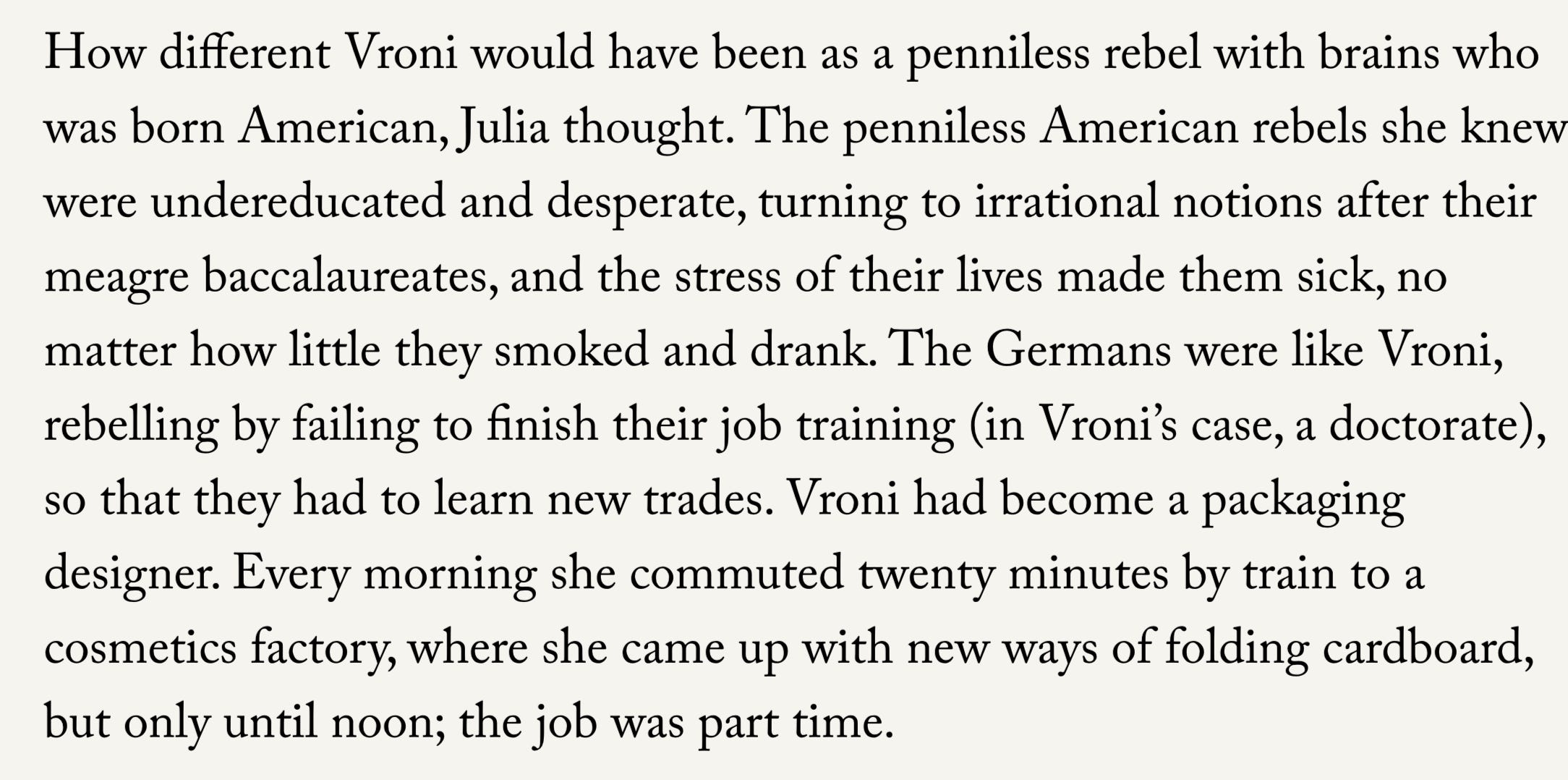 There’s a new crop of short stories from Europe this week in the negative vein. Gwendoline Riley in the Paris Review on her typical cooler, nastier axis (blank somehow); Nell Zink in the New Yorker, demonstrating her caustic playfulness (I’ve stopped calling her zany, but you could). Both have such a well-defined style, and I appreciate them for being so unable to formulate opinions outside of their fixed world views. They’ve been making the same points—about the limitations of others and ourselves, like all short stories—and I tend to want to hear them again. They have an intimidating air, an impression that hasn’t wavered for me despite having had one drink with them both. (Actually, Nell had a cup of tea, fetched from a deli down the block from the bar by my husband.)